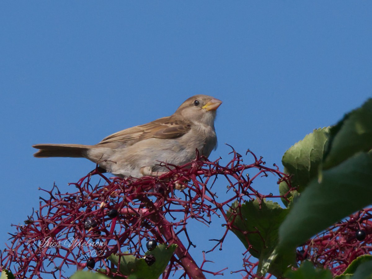 Holunderliebe. Sperling im Glück von Ines Udelnow Veröffentlicht am September 8, 2021 Die Beeren ganz oben in den Holunderbüschen sind bereits fast vertilgt. Aber in den unteren Etagen reifen noch viele leckere Holunderbeeren nach. Sperling im reifen Holunder. Gesehen am Falkplatz in Berlin. © Ines Udelnow 2021 Teilen mit: Drucken (Wird in neuem Fenster geöffnet) Drucken Einen Link per E-Mail an einen Freund senden (Wird in neuem Fenster geöffnet) E-Mail Auf Facebook teilen (Wird in neuem Fenster geöffnet) Facebook Auf X teilen (Wird in neuem Fenster geöffnet) X Auf WhatsApp teilen (Wird in neuem Fenster geöffnet) WhatsApp Gefällt mir Wird geladen … Ähnliche Beiträge