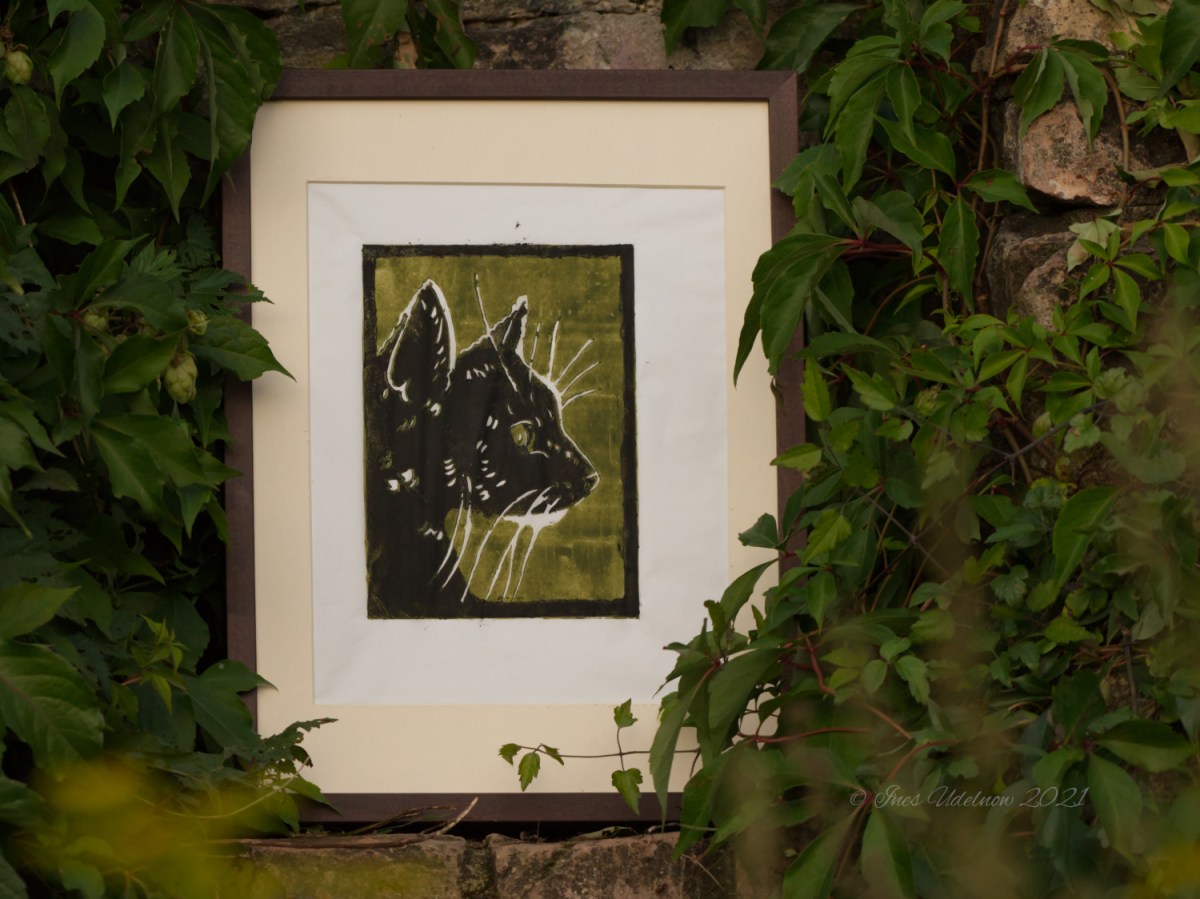 Von folgendem Linolschnitt nach dem Prinzip der verlorenen Platte entstanden insgesamt sieben Drucke. Zwei vor grünem Hintergrund und fünf vor rotem Hintergrund. Da sie gedruckten Versionen zu groß sind, um in den Scanner zu passen, ich sie aber trotzdem hier zeigen wollte, habe je eine Farbversion in einem gerahmten Passepartout, aber ohne Glasplatte, mit nach draußen ans Tageslicht genommen, um sie dort zu fotografieren. Dekorativ ist die bewachsene Steinmauer auch ohne Bild; aber im Zusammenspiel gefallen mir Mauer, Blätter und Bilder auch sehr gut.