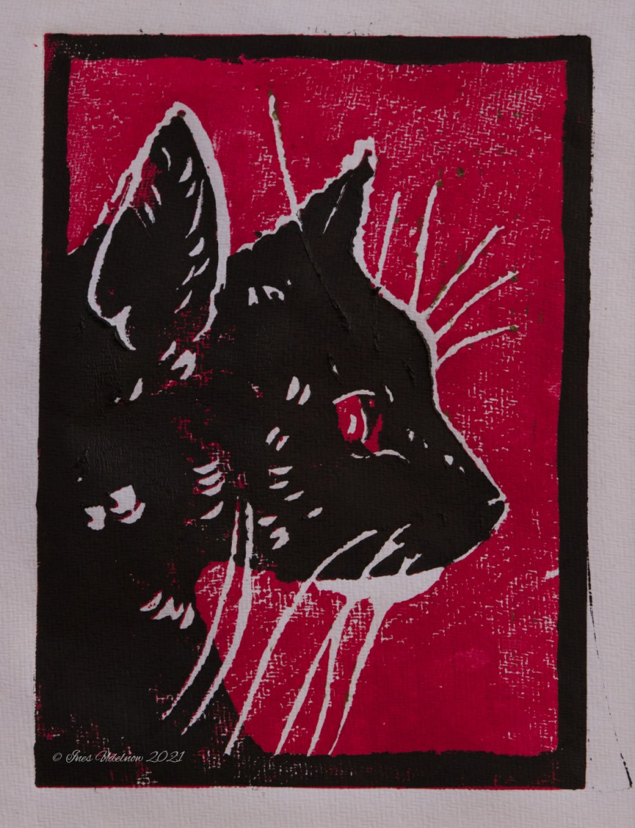 Bei den anderen roten Versionen hatte ich auf das Auge der Katze noch eine güne Schicht Farbe gedruckt, was aber die Wirkung des Auge geschmälert hatte, da auch von dem Augenweiß verloren ging. Das war auch kein Königsweg.