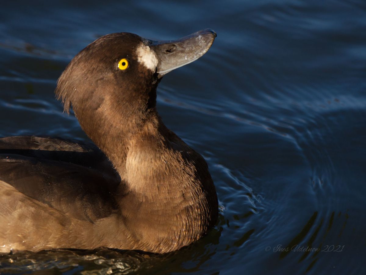 Ja, auch solche hübschen Reiherenten haben wir in Berlin. Dies hier ist eine weibliche Ente, die sich vergangene Woche bei Spätsommernachmittagssonne von mir am Märkischen Ufer beim Historischen Hafen ablichten lies. Markant – ihre lustigen gelben Augen. Die Reiherentenerpel sind schwarz-weiß gefärbt, waren aber an diesem Nachmittag nicht zu beobachten.