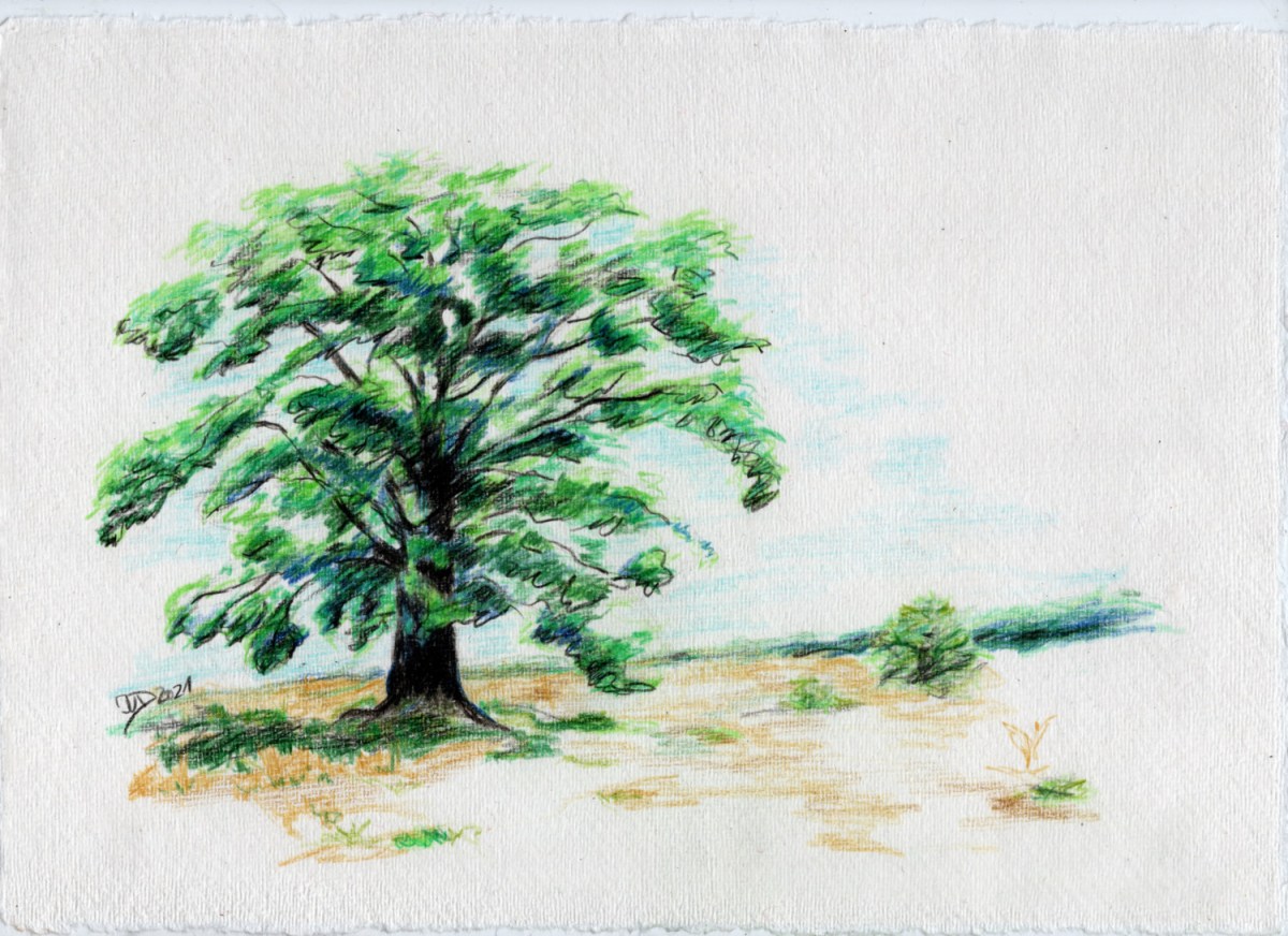 Eiche im September. Buntstifte auf Silberburg Büttenpapier A4- © Ines Udelnow 2021