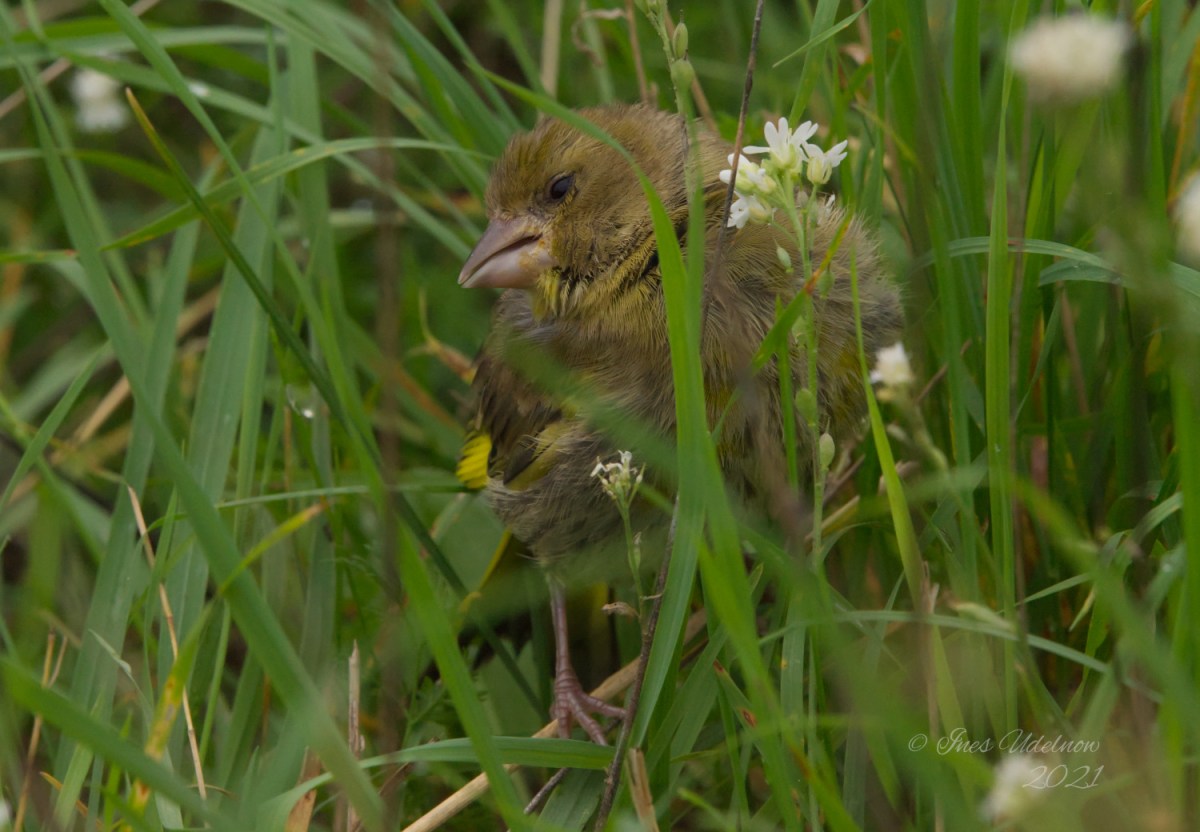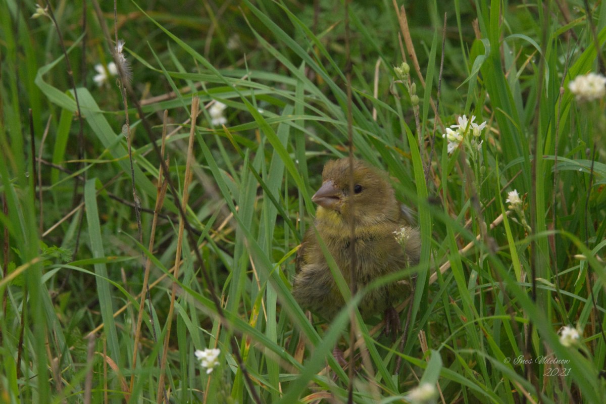 Dabei ist mir dieser junge Stieglitz vor die Kamera geflogen. Gut getarnt saß er im hohen Gras und ich habe ihn nur entdeckt, weil ich sehen konnte, wo genau er gelandet war. Er ließ es zu, dass ich ein paar Fotos machte, während ich hoffte, dass niemand des Weges käme und den kleinen Vogel aufscheuchte. Als dieser dann fand, dass das Fotoshooting abgeschlossen war, flatterte er wieder auf und ließ sich in ein paar Meter Entfernung wieder nieder.