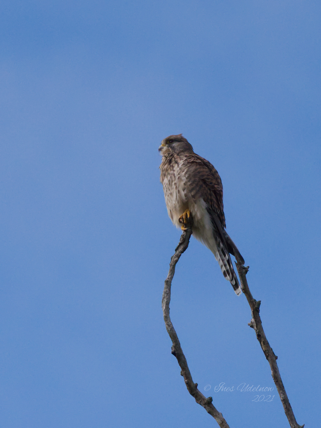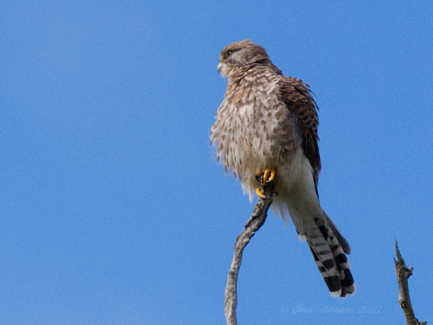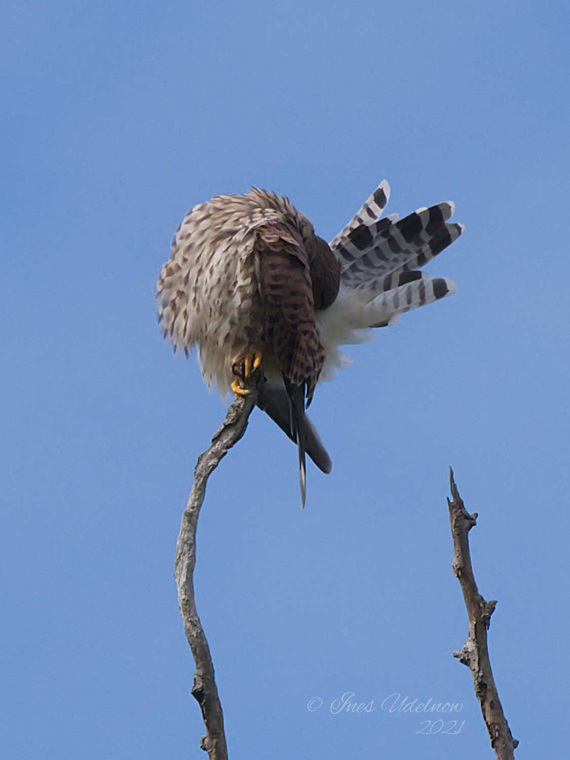 Der genannte Hahneberger Turmfalke hatte, als unsere Exkursionsgruppe ihn zum ersten Mal beobachtete, gerade eine kleine Maus verspeist. Als ich kurz darauf allein und mit gezückter Kamera wieder bei ihm ankam, hatte sich hinter ihm ein wunderbarer blauer Himmel aufgetan und die Sonne leuchtete den Gefiederten perfekt aus. Dennoch war es gar nicht so einfach, den ganzen Vogel aufs Bild zu bekommen, der nach der Mahlzeit mit akribischer Federpflege beschäftigt war und sich beständig verdrehte. Immerhin hat er uns auf diese Weise seine hübschen Schwanzfedern präsentiert.