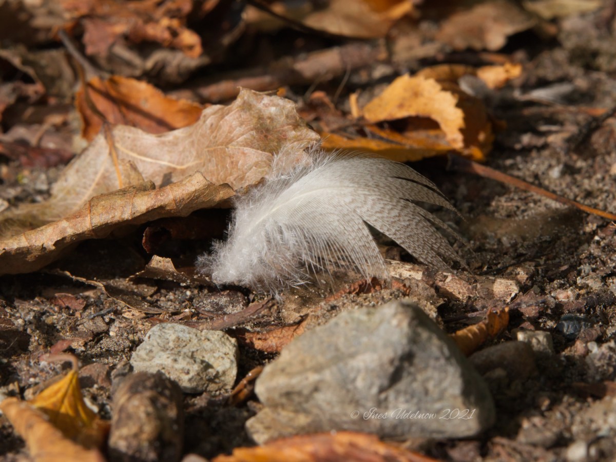 Herr Stockentenerpel verlor keinen gläsernen Schuh, ließ aber eine filigrane Feder fallen. Ein hübscher heller Tupfer zwischen den bunten Herbstblättern am Boden.
