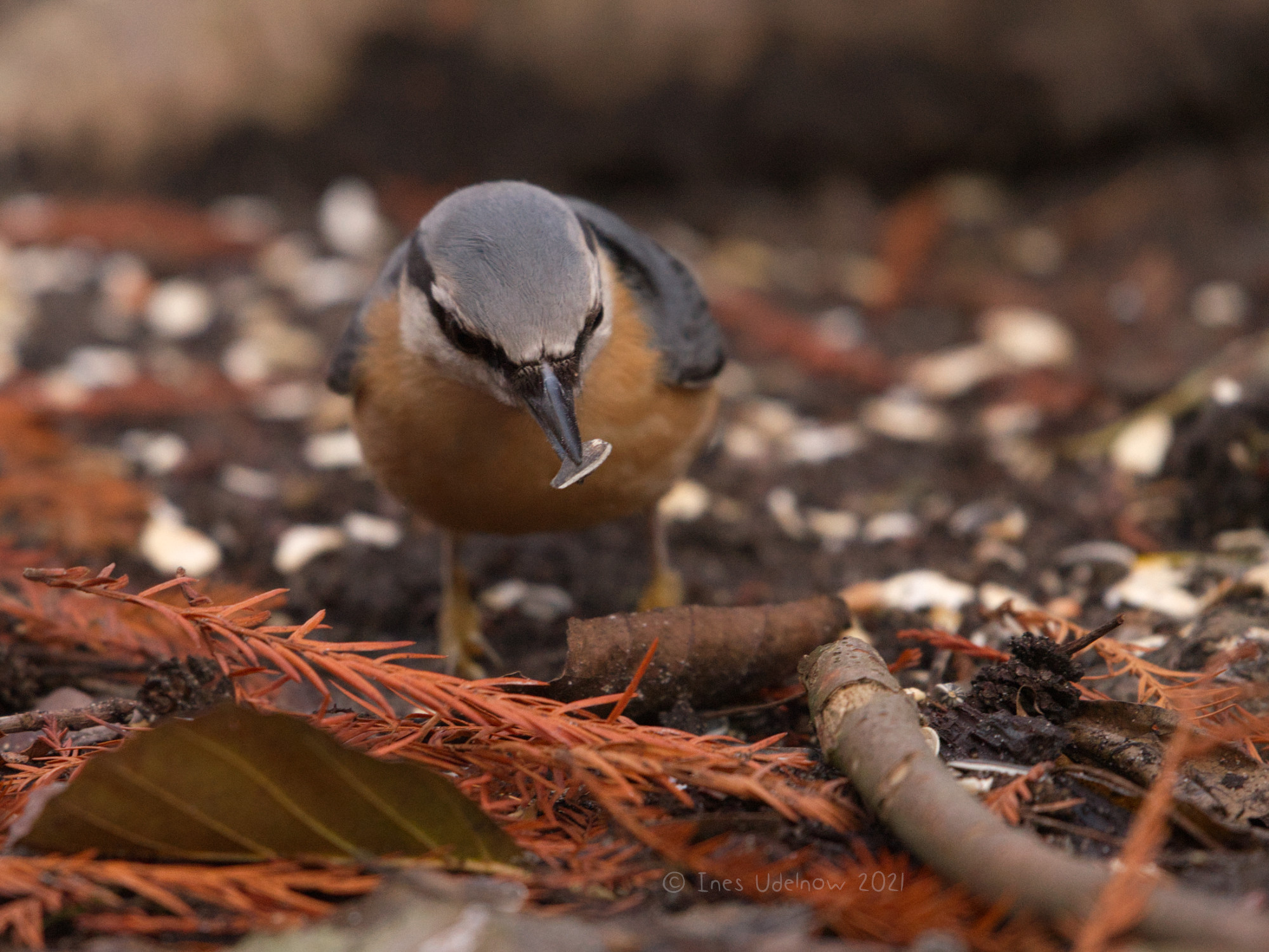 Andere halten sich nicht lange am Boden auf – landen flink, picken ein leckeres Stück Futtersaat und sind flugs wieder verschwunden. So auch dieser Kleiber.