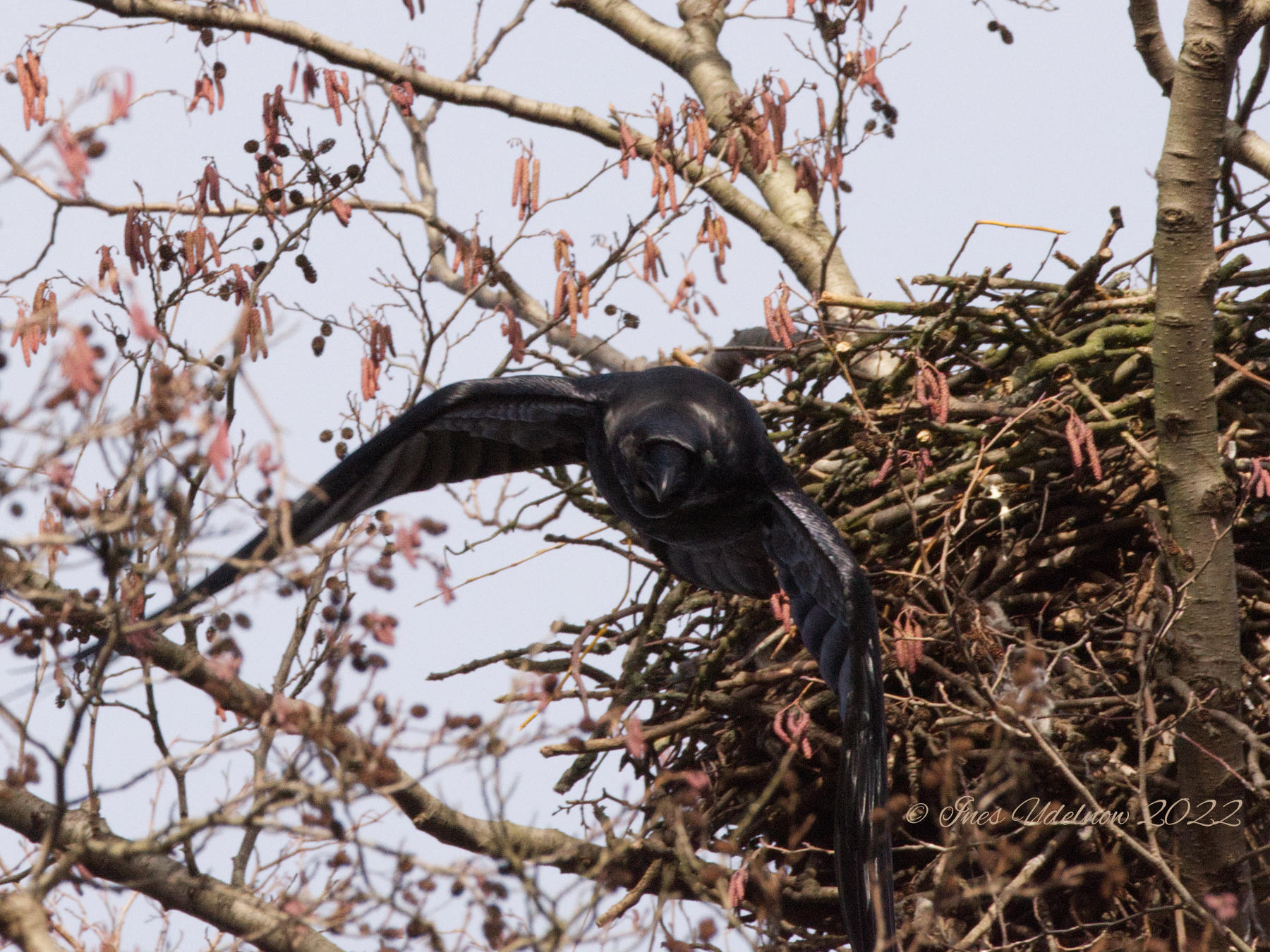 I went to the „Großer Tiergarten“ and – what a joy – saw the ravens again. One of the parent birds was already squatting (breeding?) in the nest. Almost nothing could be seen of him, but every now and then a tail tip bobbed over the edge of the nest and betrayed his presence.