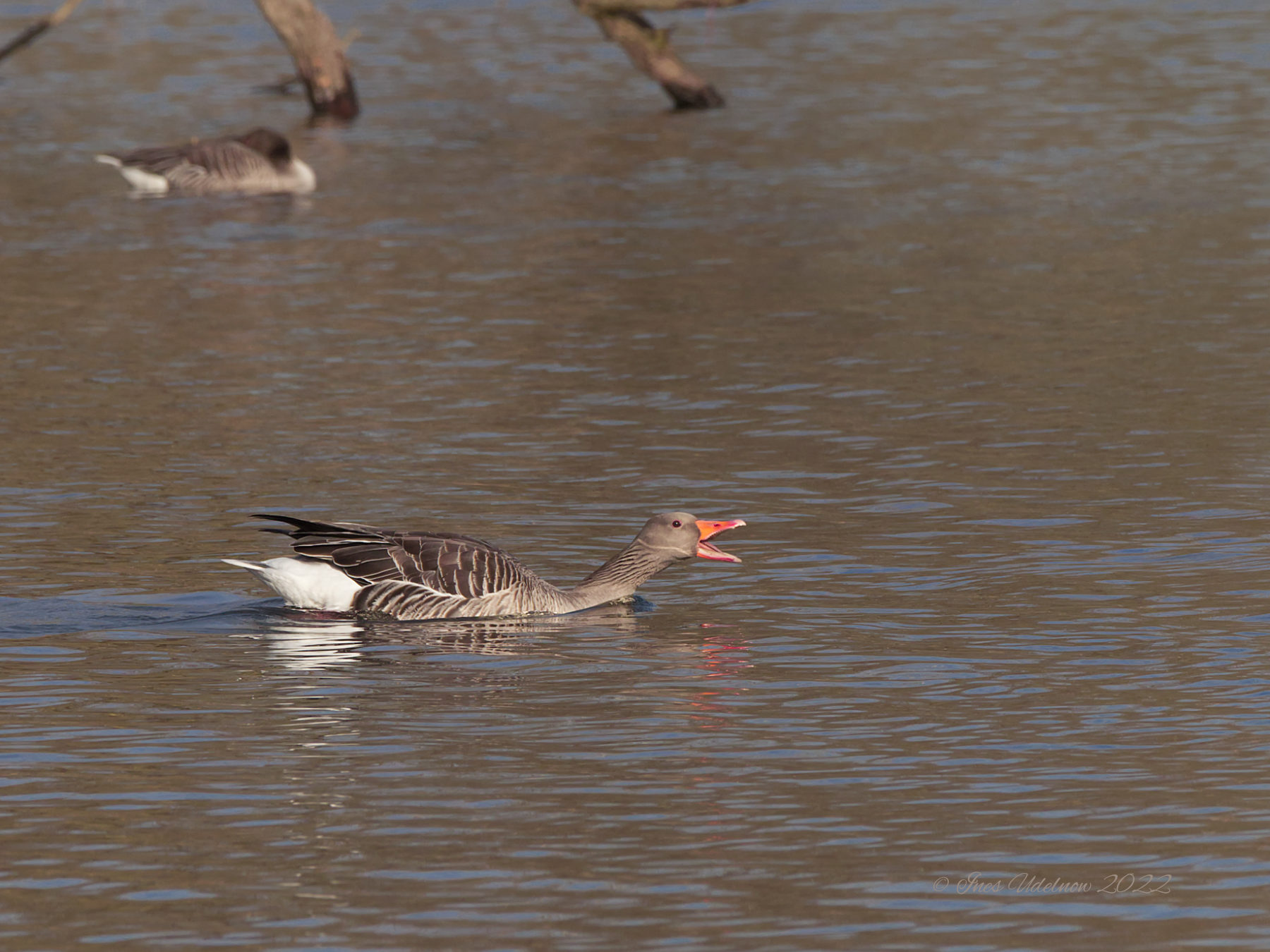 I was really lucky yesterday at Lake Köppchensee (see also my article from yesterday). In pairs of two, a dozen or so greylag geese swam across the lake in the late winter sun and gave a further sign that spring is approaching. Usually greylag geese travel in flocks, but during the breeding season they gather in pairs. In the first photo it is easy to see that males and females are similar in appearance, but the male geese are usually larger than the females.