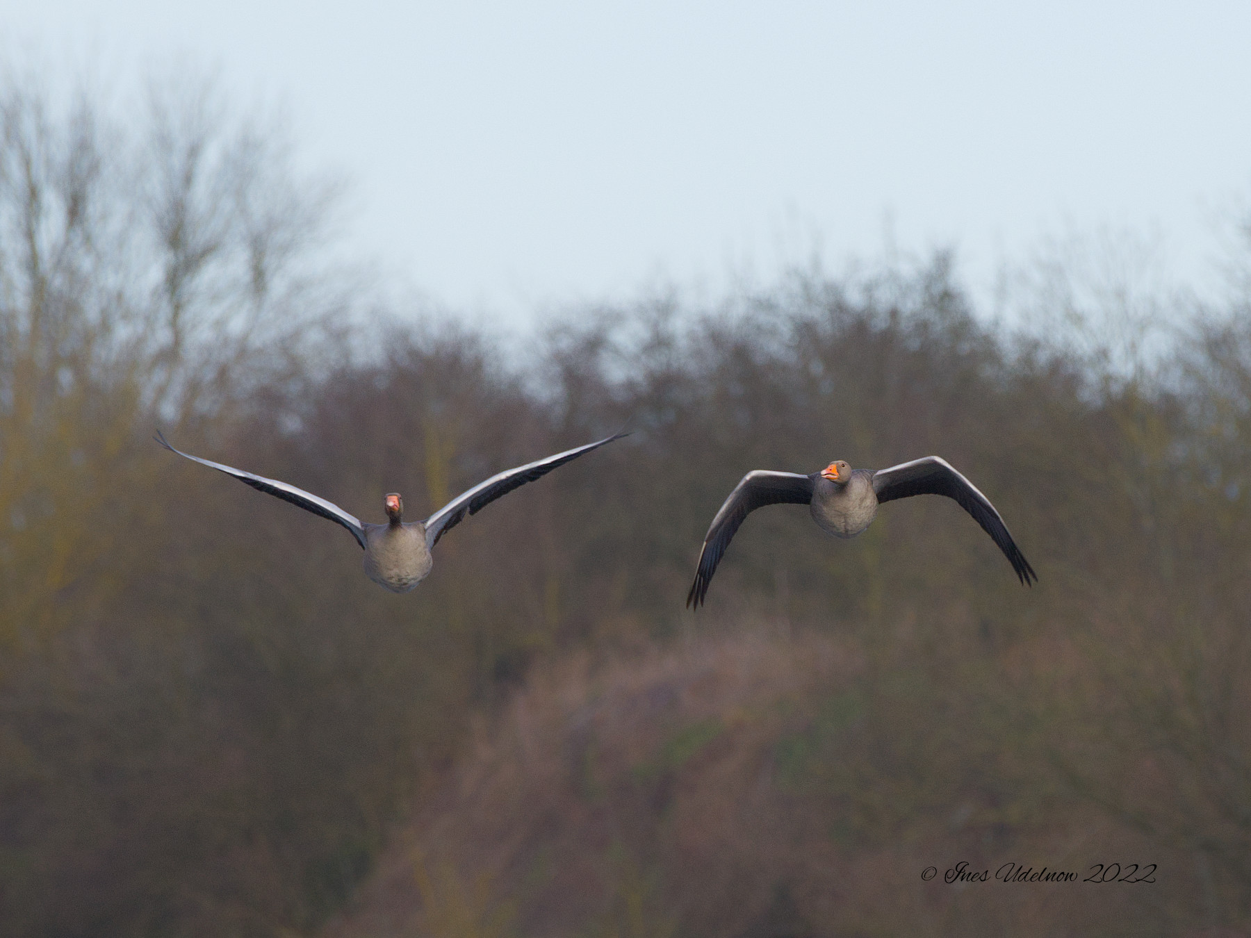 Später dann erhob sich ein Paar nach dem anderen in die Luft und entflog in Richtung Westen. Die jeweilige Flugshow startete im Fünfminutentakt und begann zunächst mit lauter werdendem Rufen, sodass sich die Fotografin schon einmal einrichten konnte und einige ganz brauchbare Aufnahmen zustande kamen.
