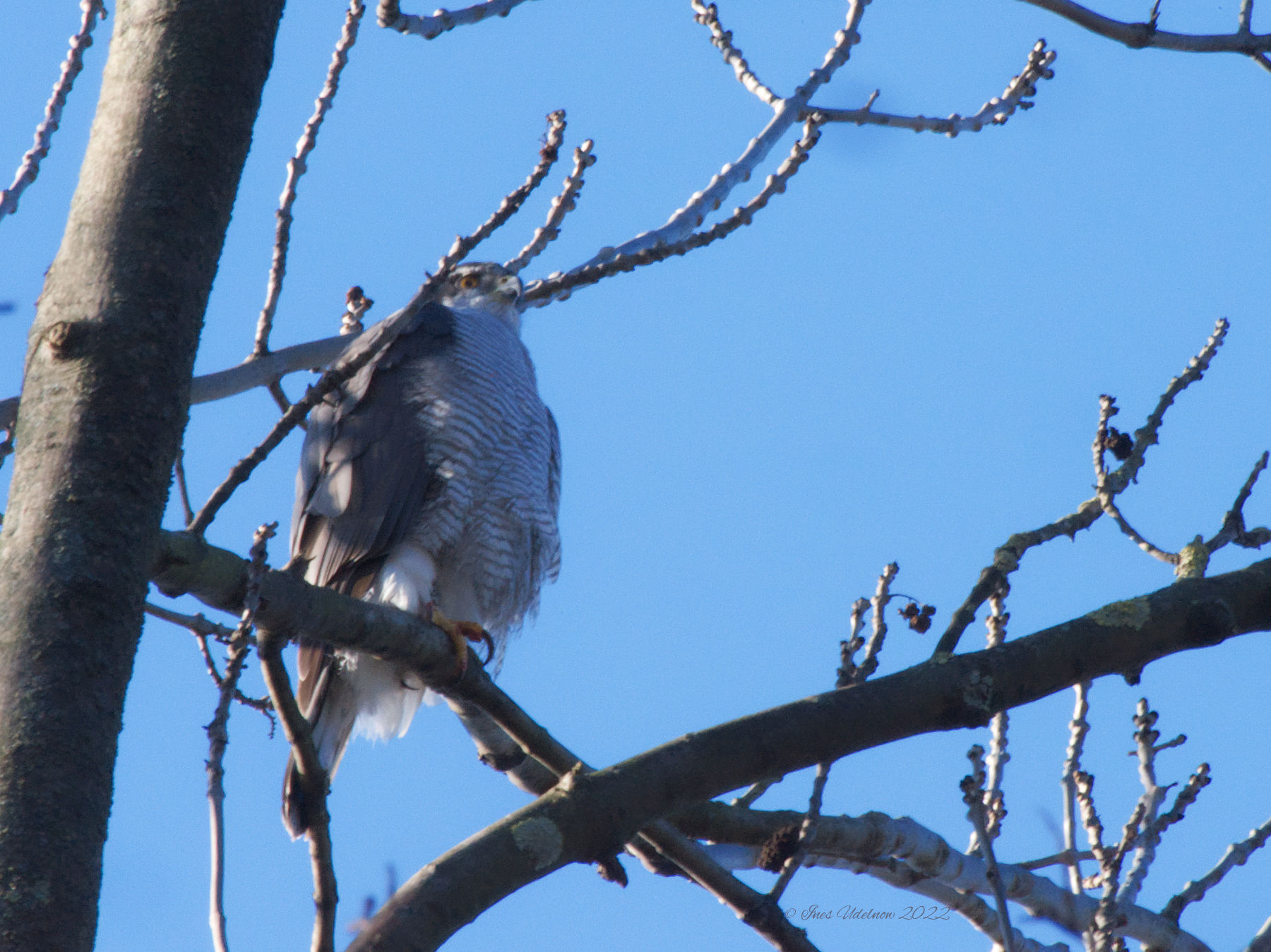 Сначала я заметила одного из двух ястребов (Accipiter gentilis) высоко на дереве. Трудно заметить невооруженным глазом, но очень легко увидеть с помощью телеобъектива, включая телеконвертер. Я терпеливо наблюдала за гнездом ястреба некоторое время, и через некоторое время я даже смогла разглядеть спину ястреба. К моей большой удаче, прямо рядом с моей тропой сидел другой ястреб-тетеревятник, прекрасно освещенный солнцем, его уже ощипанная добыча была хорошо видна в когтях. Судя по перьям, которые я обнаружила на земле, голубь испустил свой последний вздох.