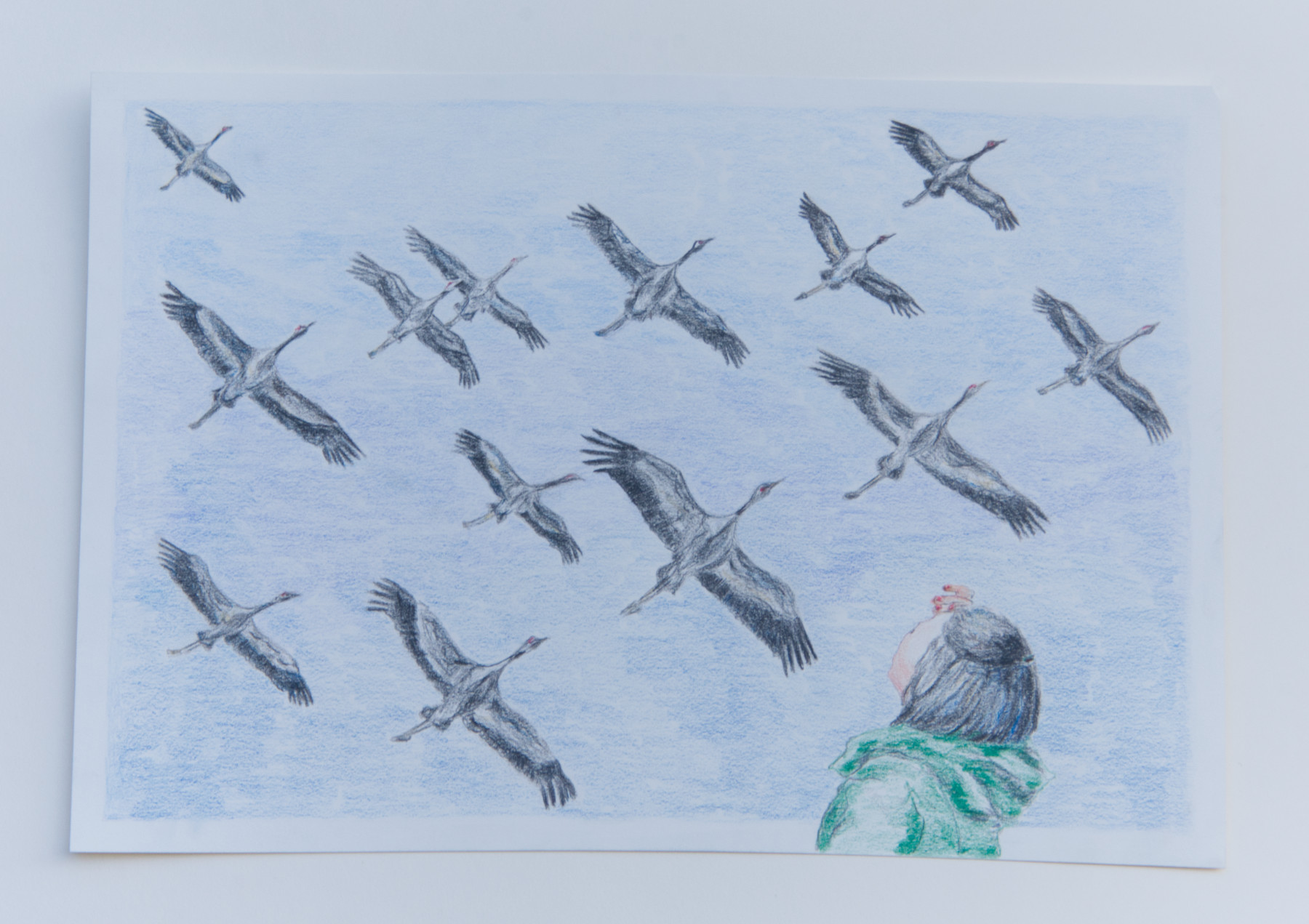 Возьми меня с собой! Журавли в небе. Рисунок цветным карандашом на бумаге, формат А3. © Инес Удельнов 2022