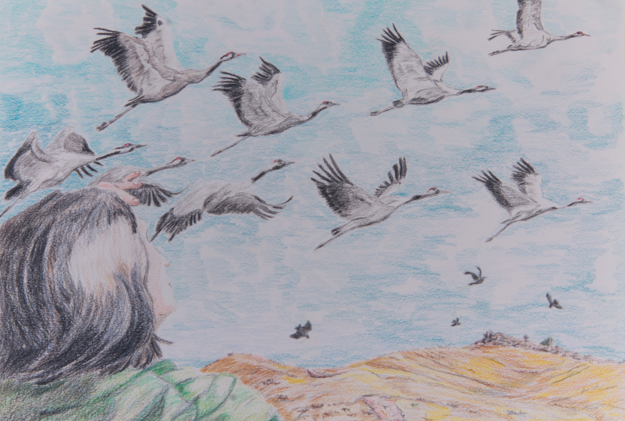 Журавли в небе. Рисунок цветным карандашом на бумаге, формат А3. © Инес Удельнов 2022