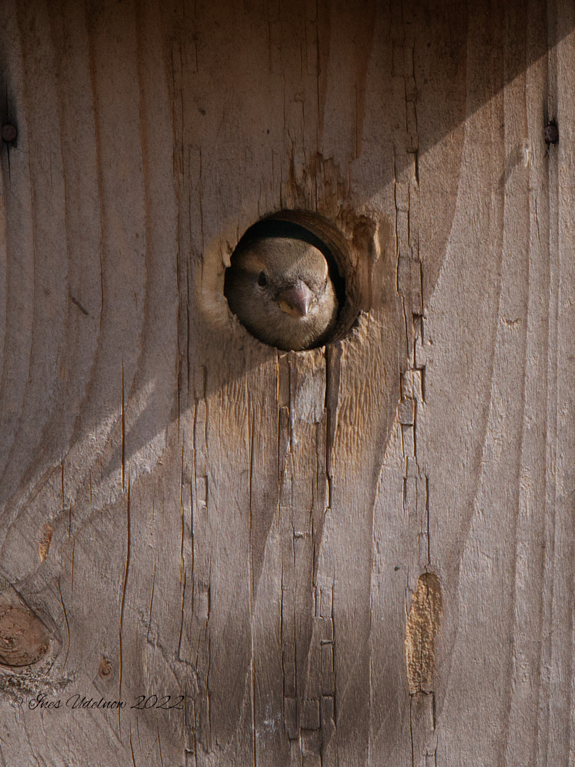 Es ist Nist- und Brutzeit. Auch um die Baumhöhlen und Nistkästen dieser Stadt herrscht reges Treiben. Hier schaut sich eine Sperlingsdame (Haussperling – Passer domesticus) erst einmal genau um, bevor sie aus ihrem sicheren Nistkasten hinausfliegt.