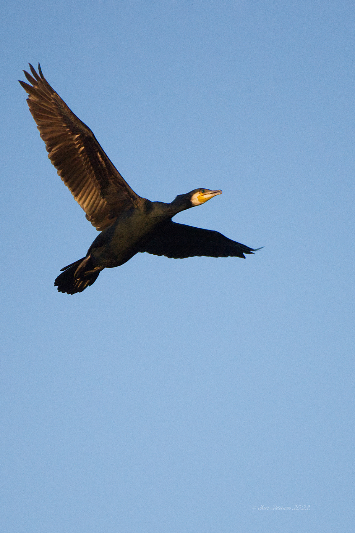 Cormorant (Phalacrocorax carbo) in the evening sun, May 2022 over Lake Köppchensee/Berlin