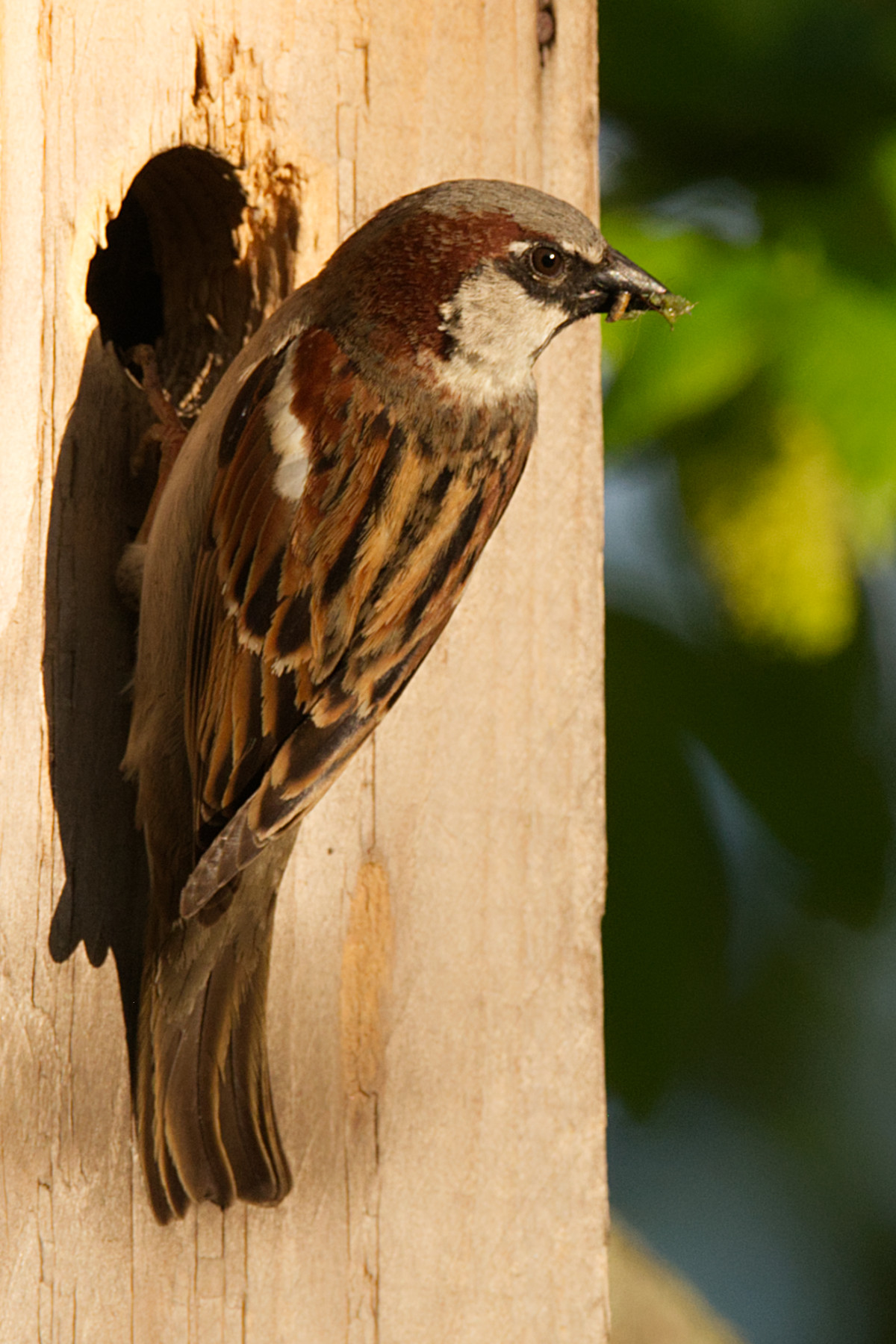 Bei der Gelegenheit fiel mir wieder ein, dass auf meiner Festplatte noch eine Reihe aktuelle Spatzenhäuserfotos auf Durchsicht und Entwicklung warteten. Hier also ein Spatzenpapa bei der Fütterung.