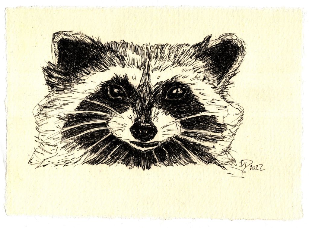 Raccoon. Fineliner on Silberburg handmade paper in A5 format, © Ines Udelnow 2022