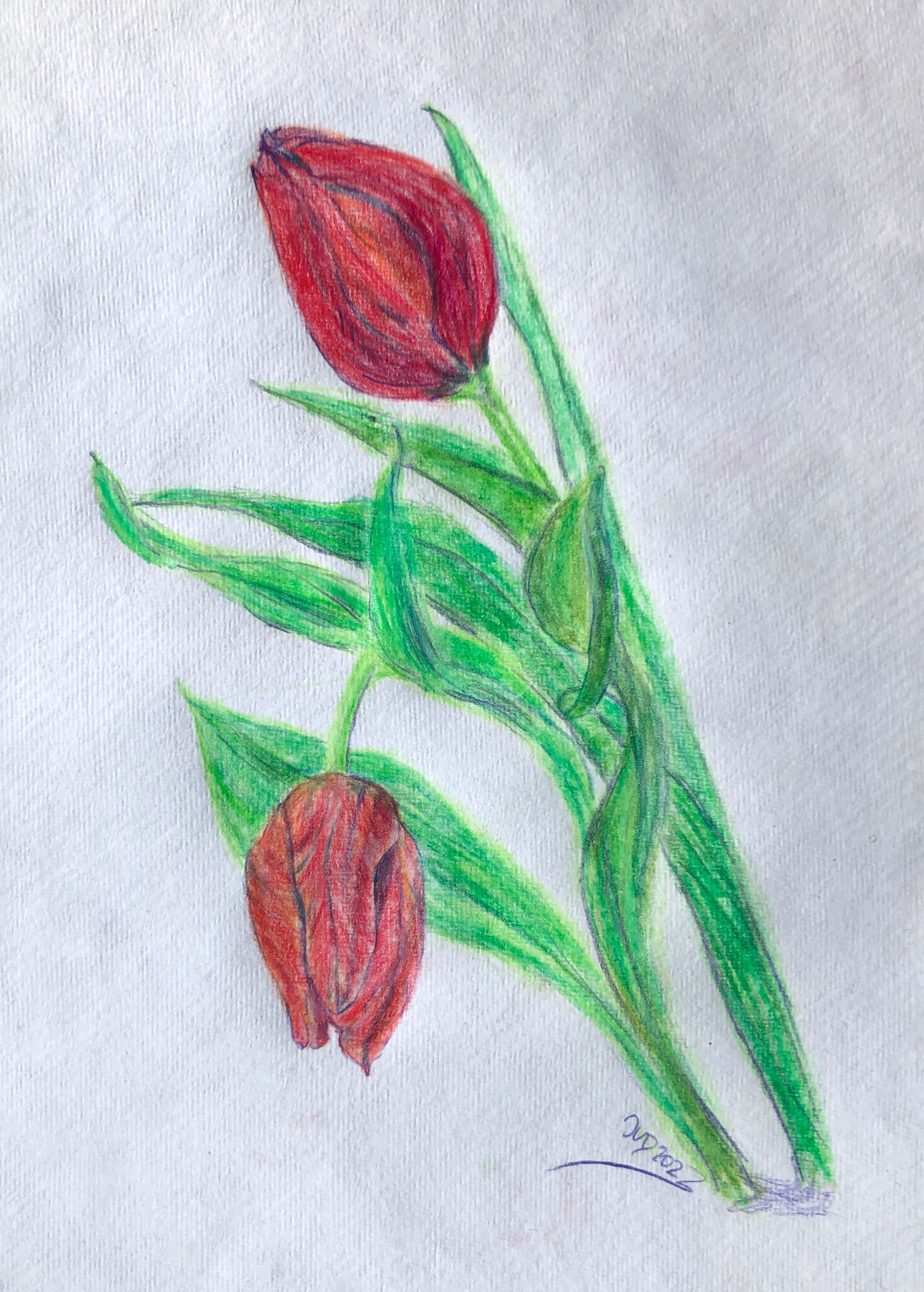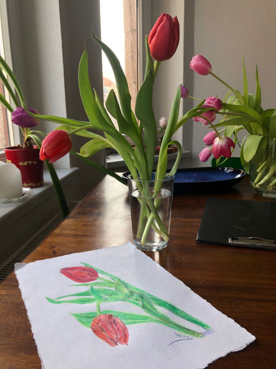 Zwei Tulpen. Buntstifte auf Silberburg Büttenpapier, Format A4. © Ines Udelnow 2023