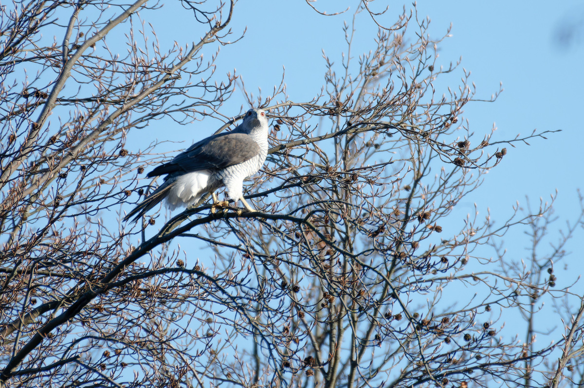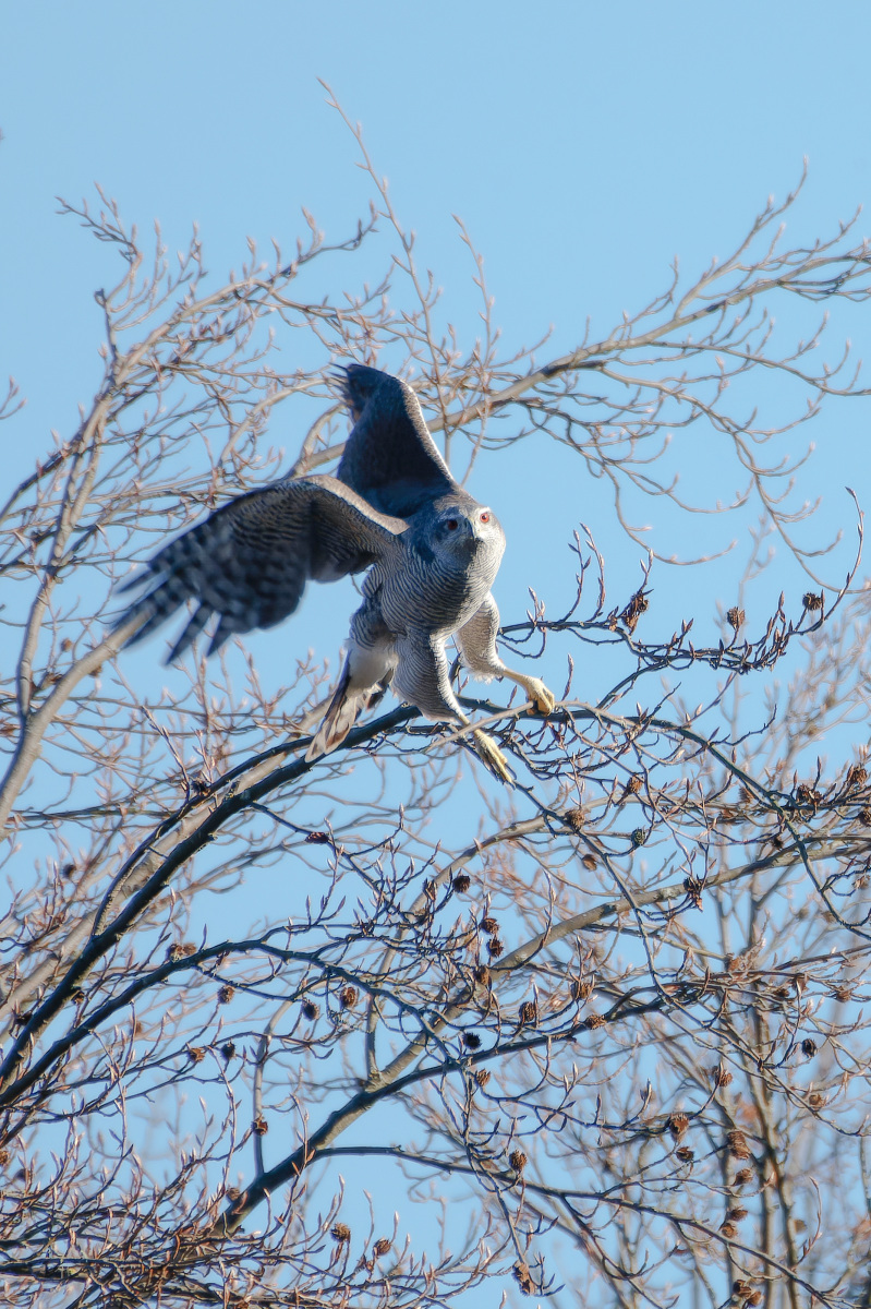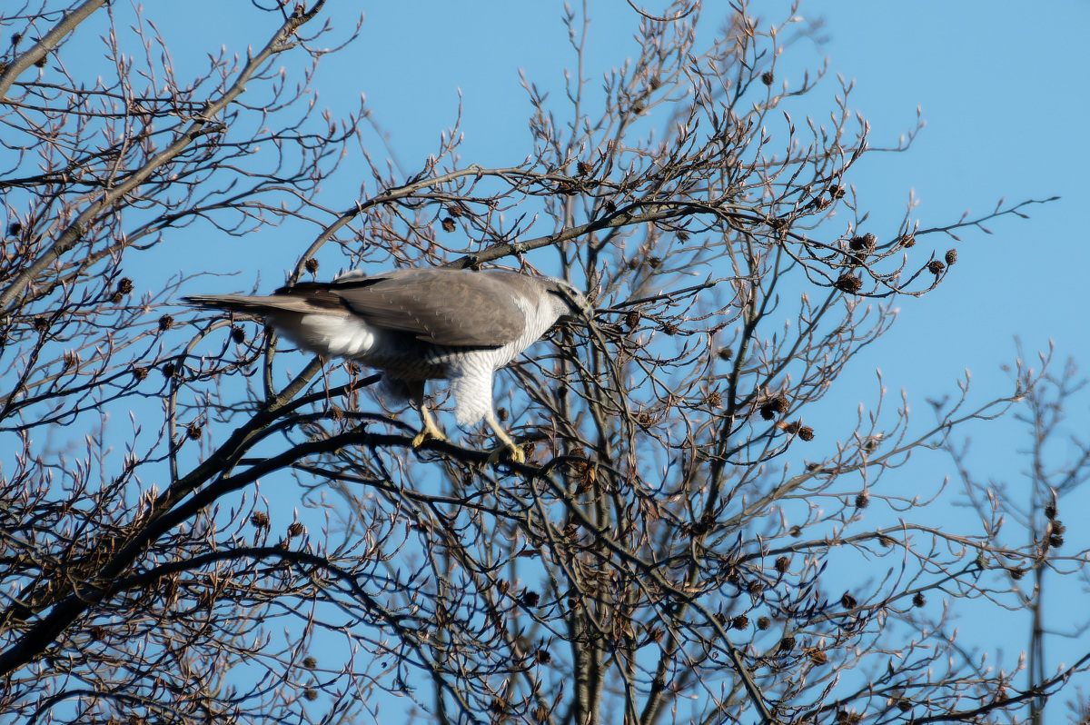 Habt Ihr auch das Gefühl, der Winter sei fast vorbei oder geht es nur mir so, dass ich trotz klirrender Kälte und eisrutschigen Straßen und Wegen einen Hauch von Frühling spüre? Vielleicht liegt es an den immer länger werdenden Tagen, vielleicht auch an der derzeit besonders hell strahlenden Wintersonne. Oder es liegt an den Stadtvögeln, von denen einige bereits rege beim Nestbau sind. So auch dieser Habicht, den ich am Montag in der Berliner Innenstadt erst hörte und später dann auch hoch oben in einem Baum entdeckte, wie er sich einen Zweig abrupfte, um ihn zu seinem Horst zu tragen. Was für ein Glück, dass ich gerade mit Kamera und Teleobjektiv unterwegs und zur richtigen Zeit am besten Ort war. Bester Anreiz um meinen vernachlässigten Blog mal wieder mit neuem Stoff zu füttern.
