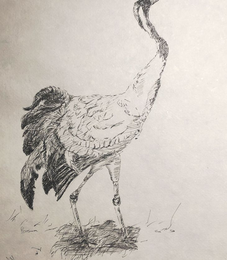 Bleistiftzeichnung Kranich, auf Silberburg Büttenpapier, Format A5, © Ines Udelnow 2022 Pencil drawing Crane, on…