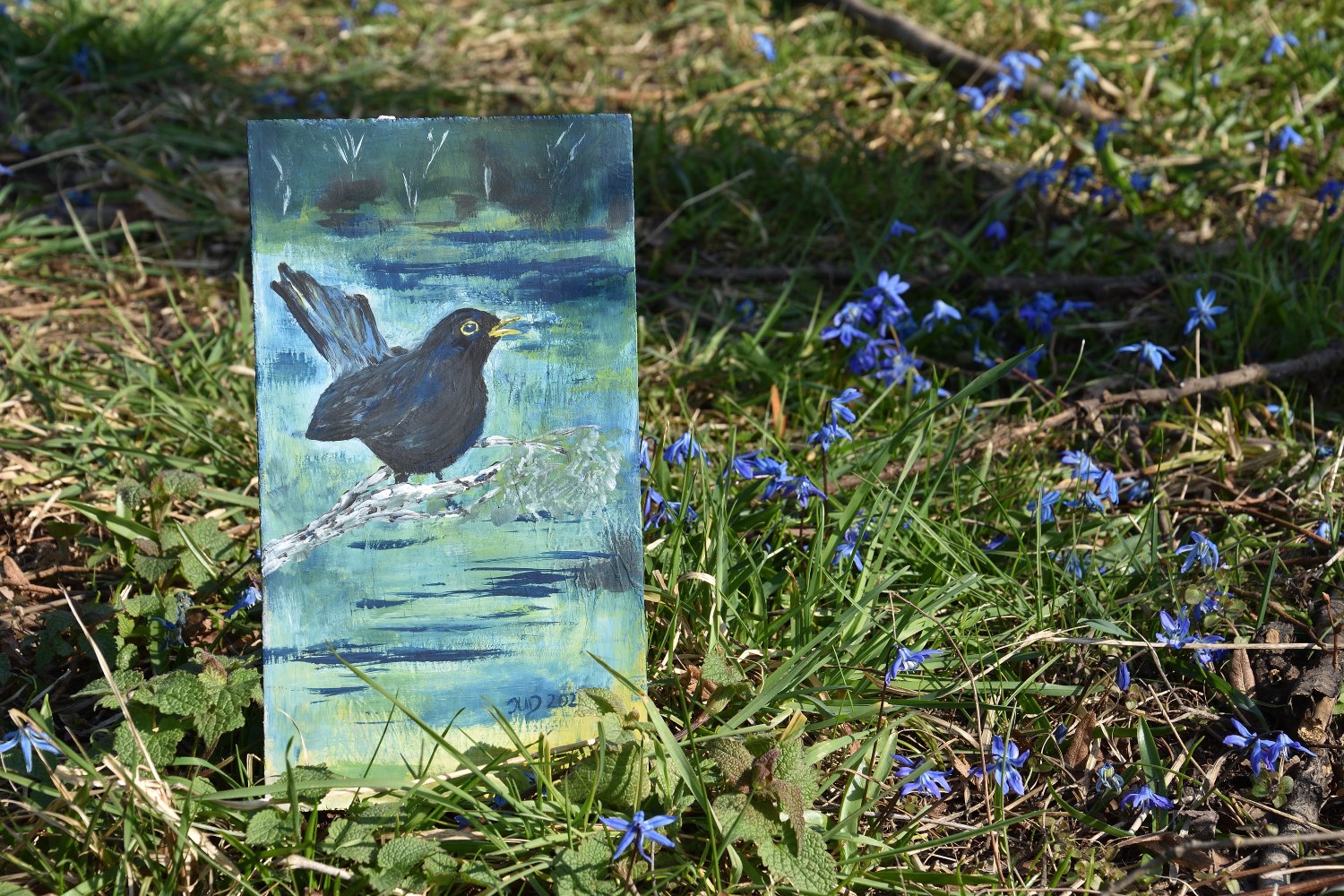 Kunst auf Zigarrenkistenbrettchen. Noch eine Amsel
