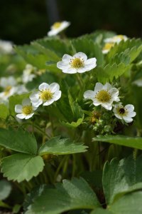 Erdbeerpflanzen mit Blüten. Die Blüte rechts vorn im Bild mit Frostschaden