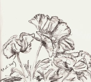 Mohnblüten im Garten, Bleistift im Skizzenbuch, 31.05.2019