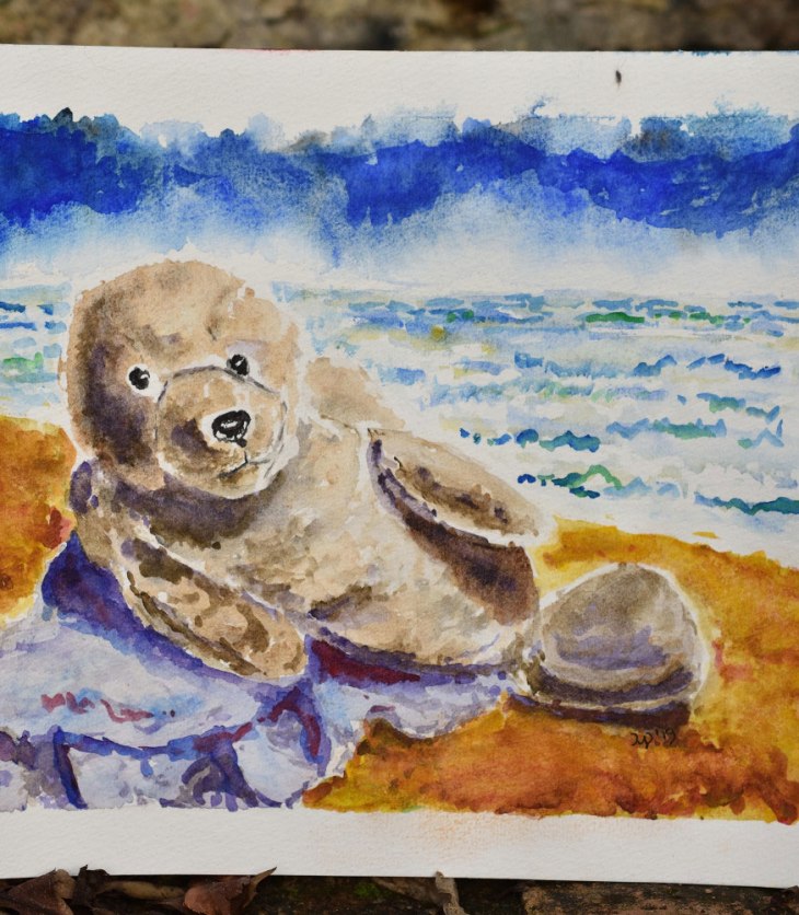 Das kleine Aquarell der kleinen töchterlichen Plüschrobbe in seiner finalen Version, wieder draußen im…