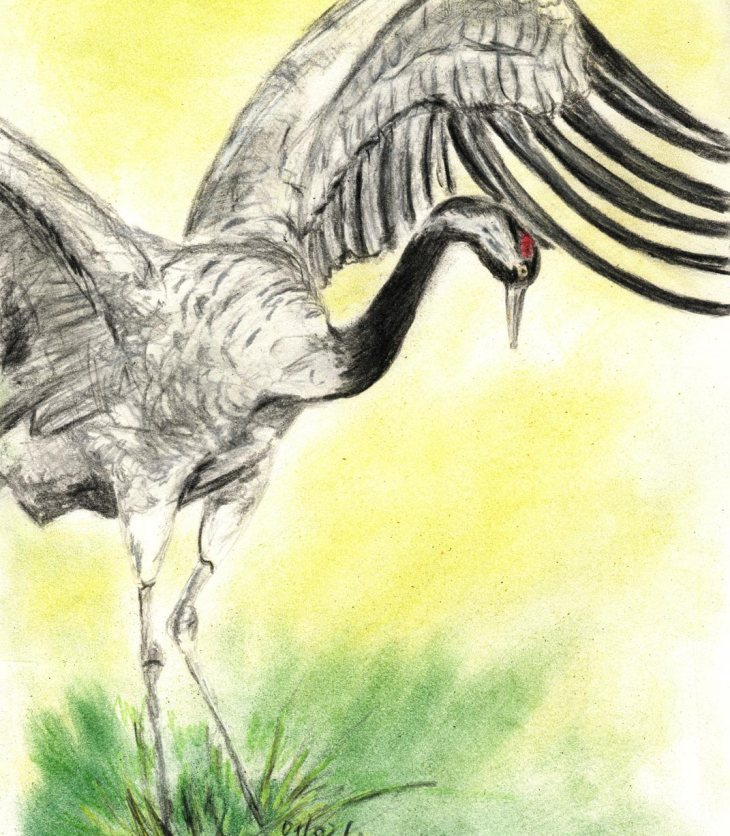 Bleistiftzeichnung Kranich, auf Silberburg Büttenpapier, Format A5, © Ines Udelnow 2022 Pencil drawing Crane, on…