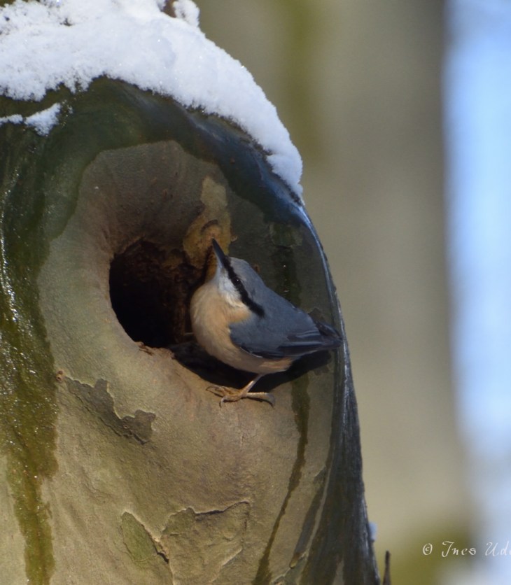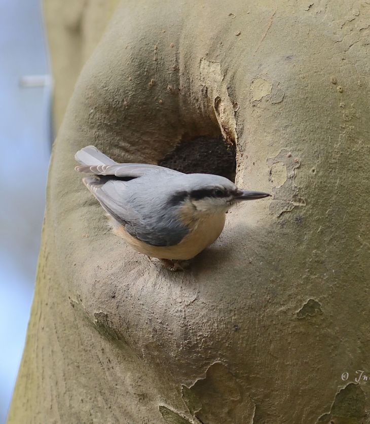 Noch einmal Bilder vom Kleiber, wie er die Baumhöhle in der Plantane untersucht, in der…