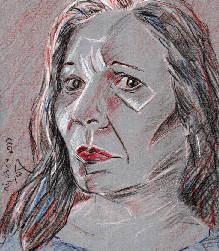 Selbstportrait am 05.04.2023, grauer Karton, Format A4. © Ines Udelnow 2023 Self-portrait on 05.04.2023, grey…