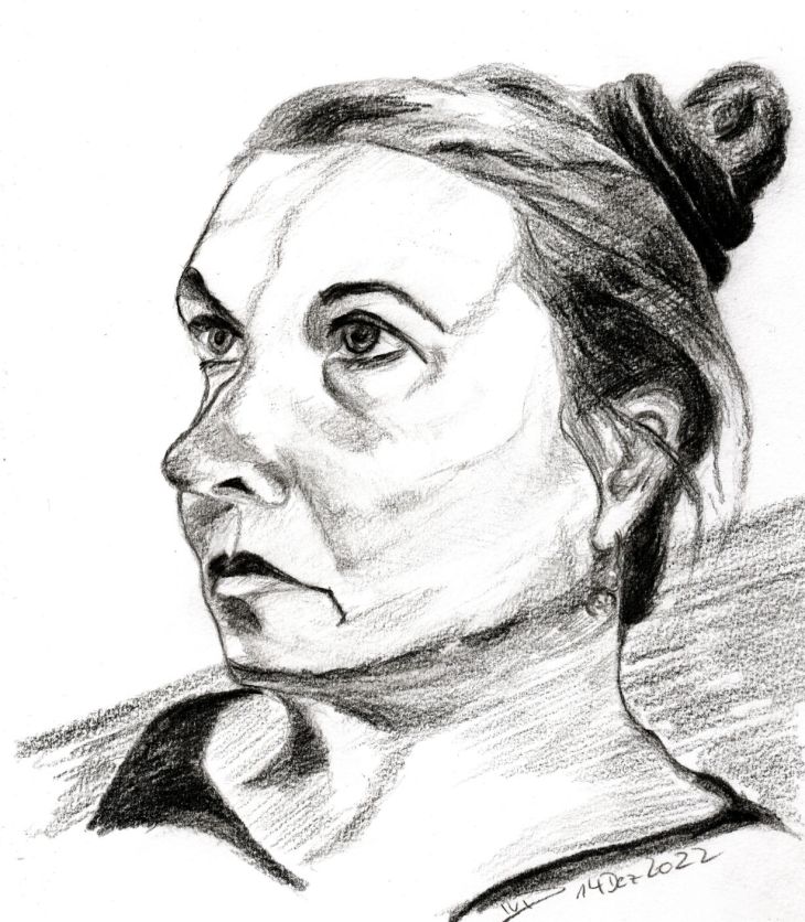 Selbstportrait am 23.02.2023, Bleistifte auf Silberburg Büttenpapierm Format A4. © Ines Udelnow 2023 Self-portrait on…