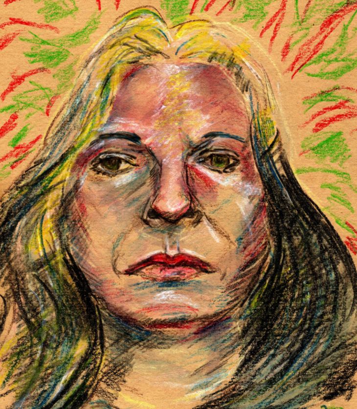Selbstporträt am12. Oktober 2022, Farbstifte auf naturfarbenem Zeichenkarton, A4. © Ines Udelnow 2022 Self-portrait on…